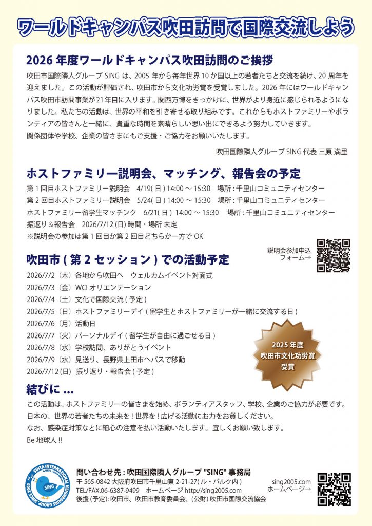 来年もワールドキャンパスの留学生が吹田にやってきます。