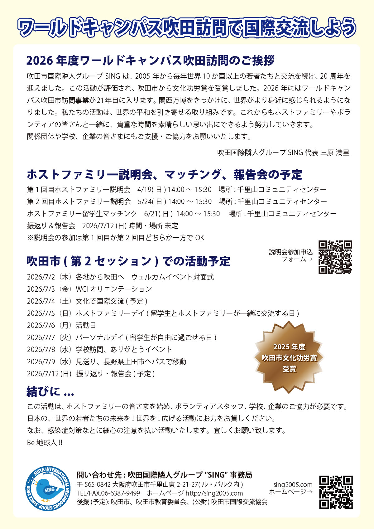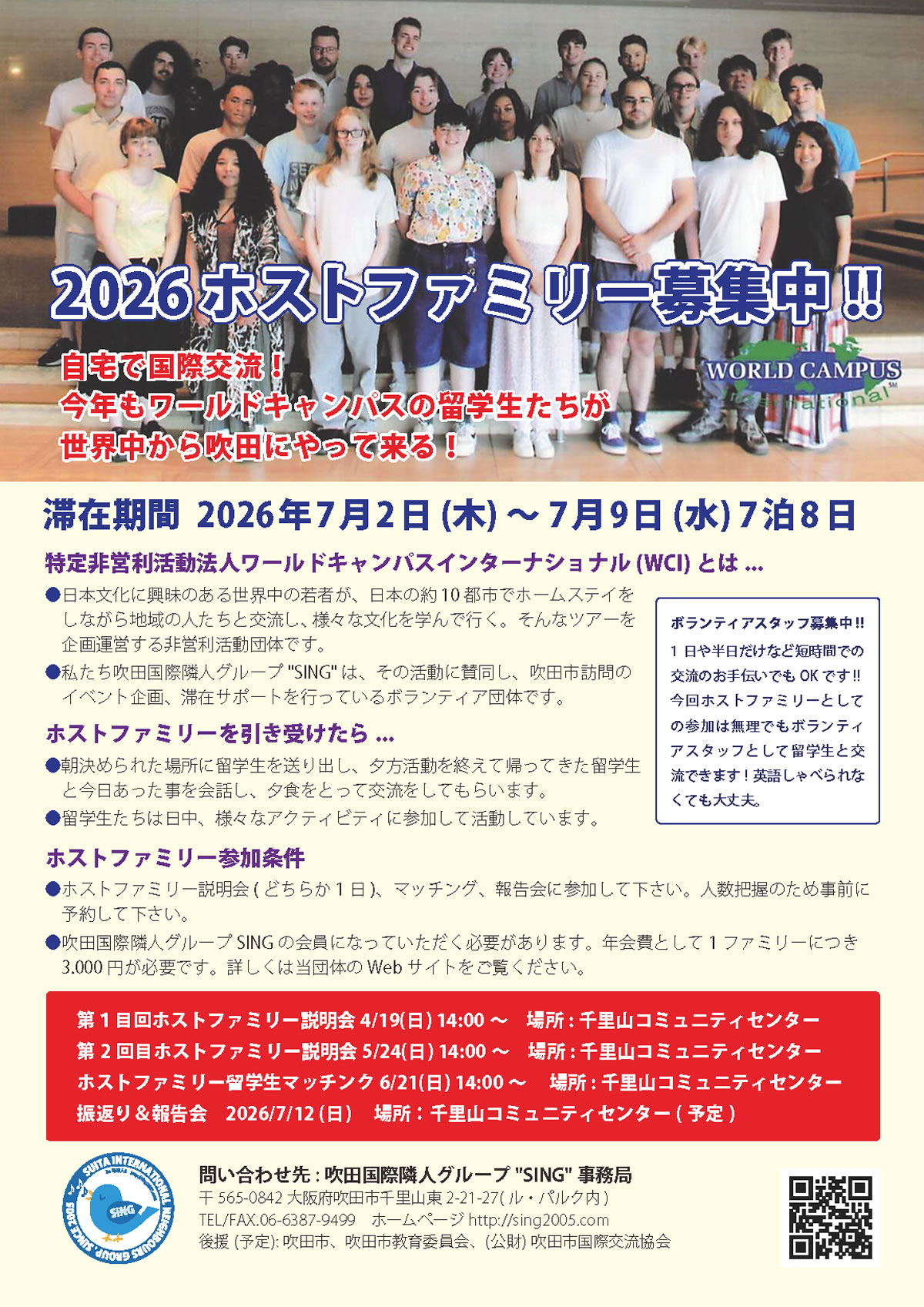 吹田国際隣人グループ(Suita International Neighbors Group)以下「SING」は主にWCI(World Campus International) の国際交流活動をサポートする事を目的とするボランティア団体です。